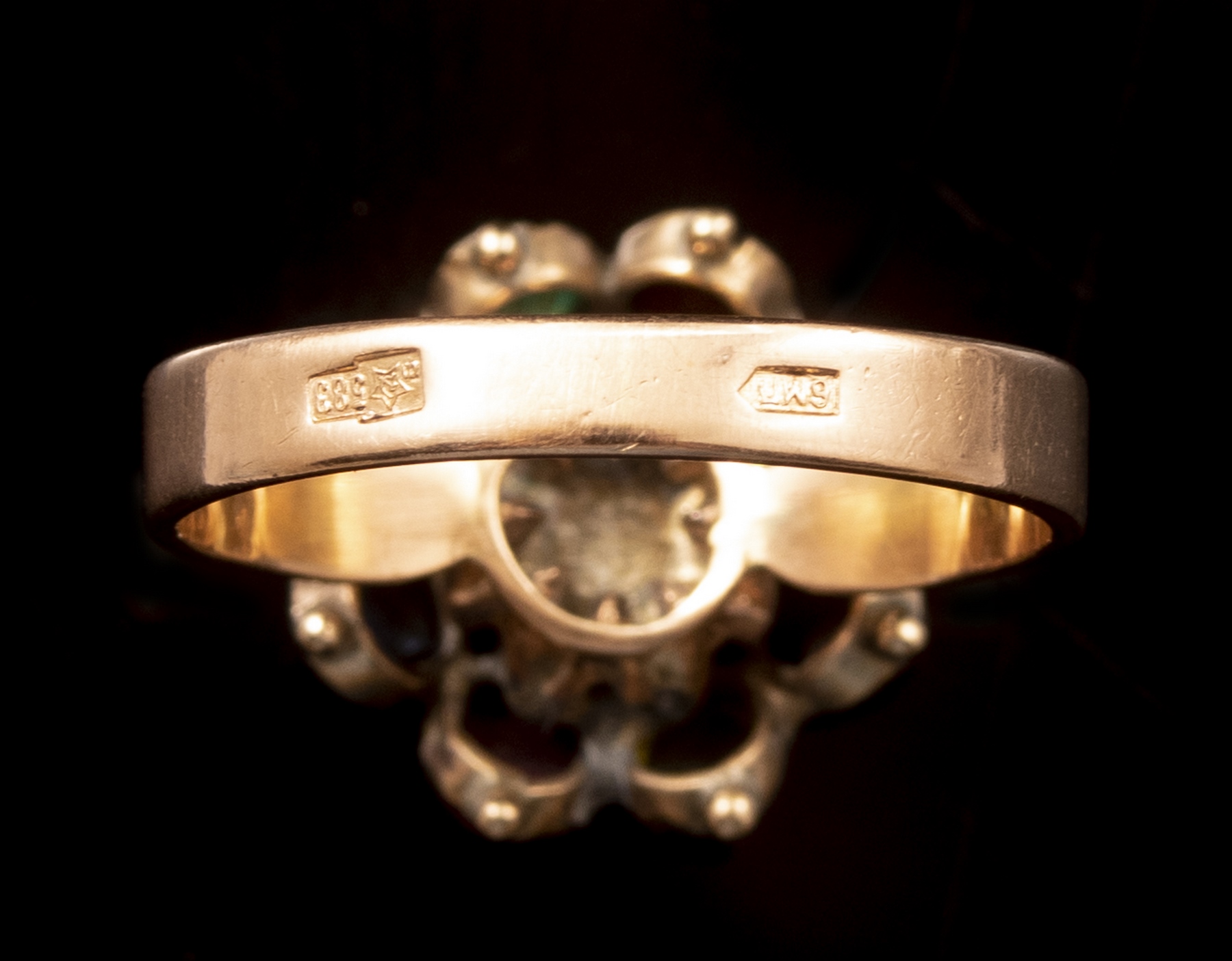 טבעת זהב 14K סובייטית בצורת פרח, משובצת דיאמנט מרכזי (6X4 מ"מ) וסביבו 8 אבני חן שונות. מידה: 3/4 8 US, משקל: 4.7 גרם. חתומה.