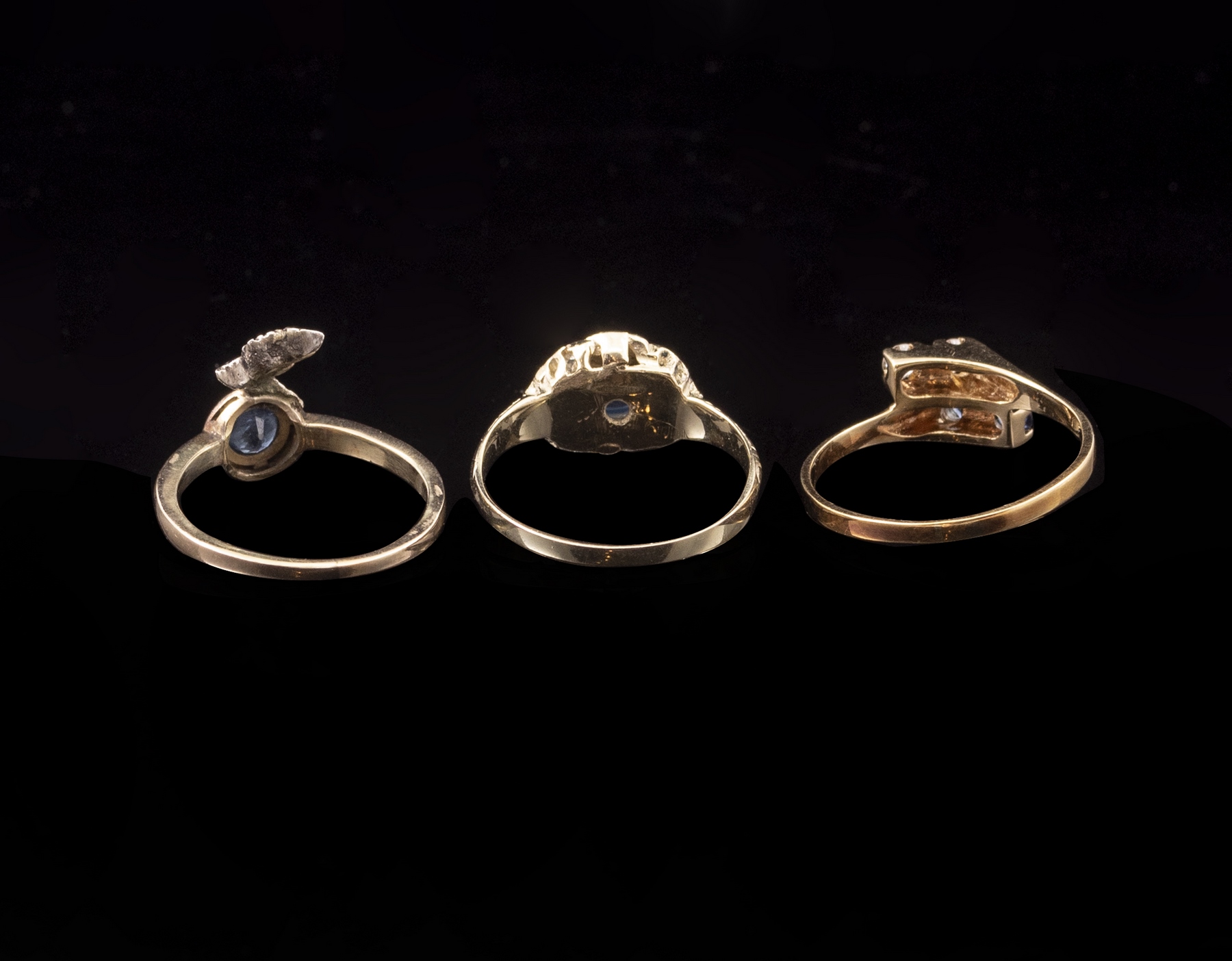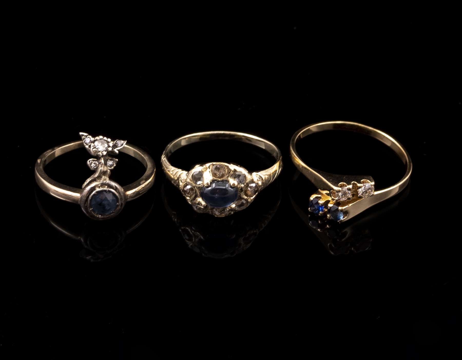 לוט 3 טבעות זהב כולל שתי טבעות 14K משובצות ספירים ודיאמנטים (משקל כולל: 4.7 גרם) וטבעת זהב 18K משובצת 2 יהלומים במשקל 4 נק' כ"א ו-2 ספירים (משקל: 2 גרם). סה"כ משקל כולל: 6.7 גרם. מידות: 6.5-8 US, לא חתומות, הזהב נבדק.