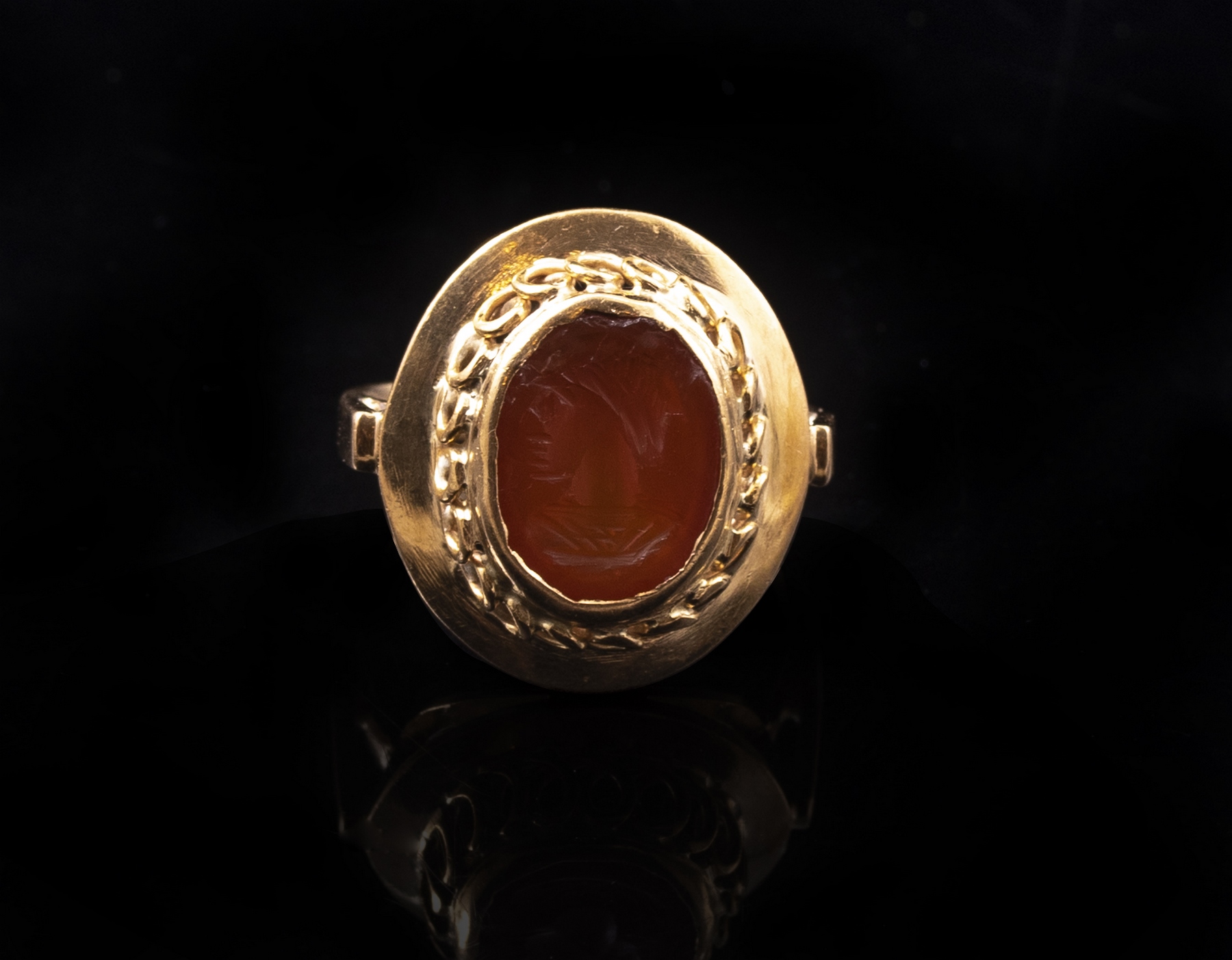 טבעת זהב 18K משובצת חותם אינטגליו עשוי אגאט. מידה: 5.5 US, משקל: 5.6 גרם. לא חתומה, הזהב נבדק.