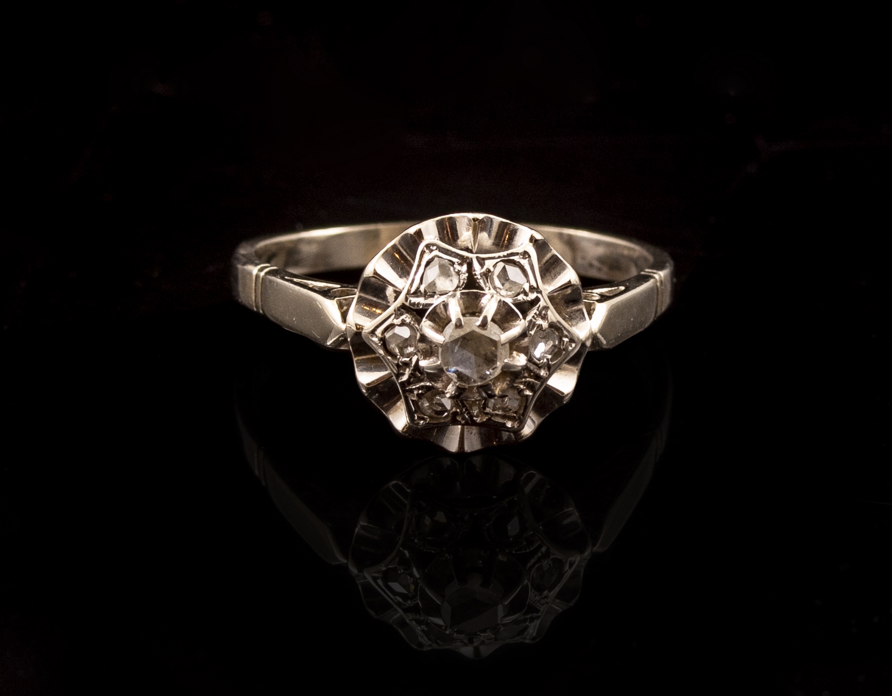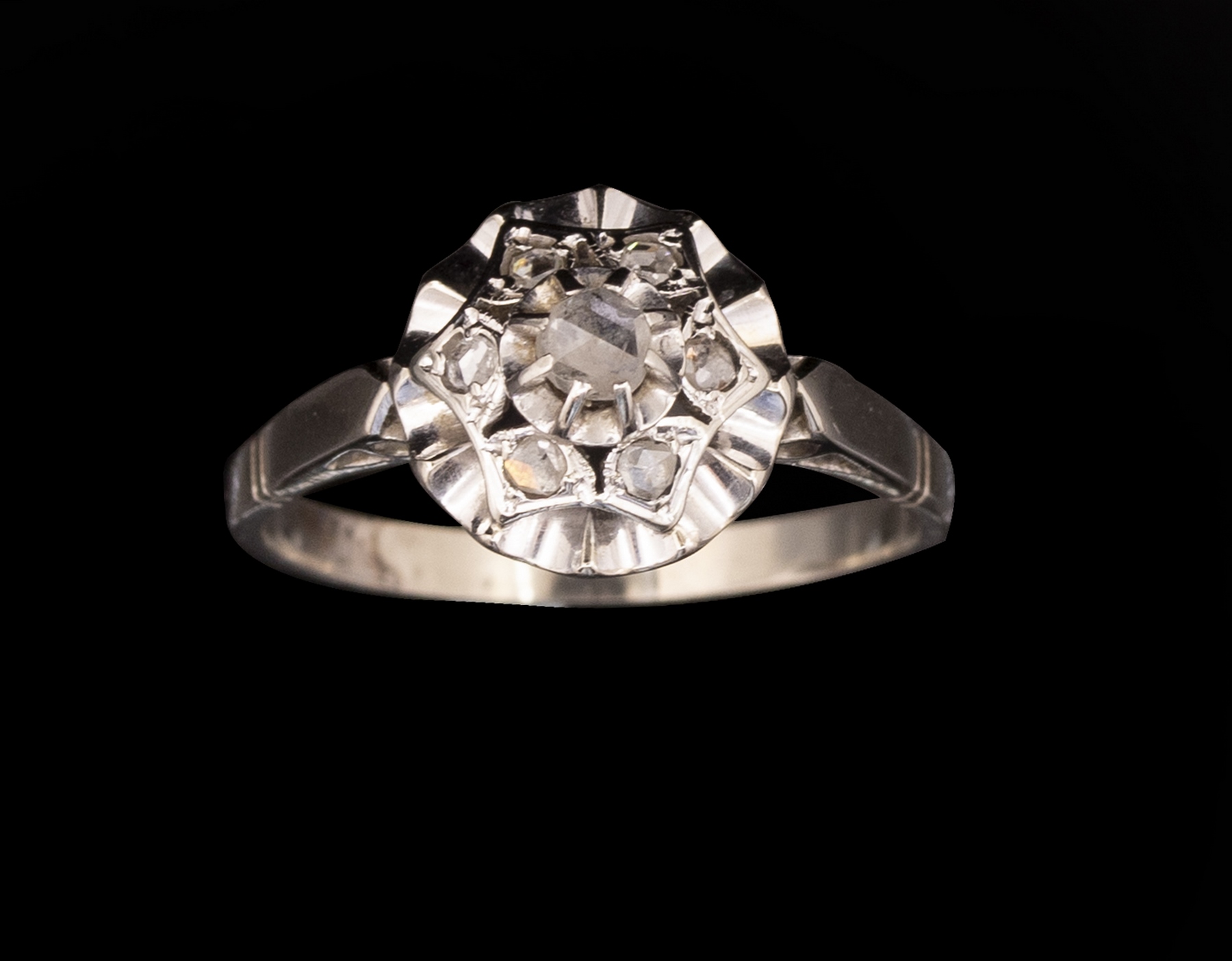 טבעת זהב לבן 18K משובצת דיאמנטים. מידה: 8 US, משקל: 3.5 גרם. חותמת שחוקה, הזהב נבדק.