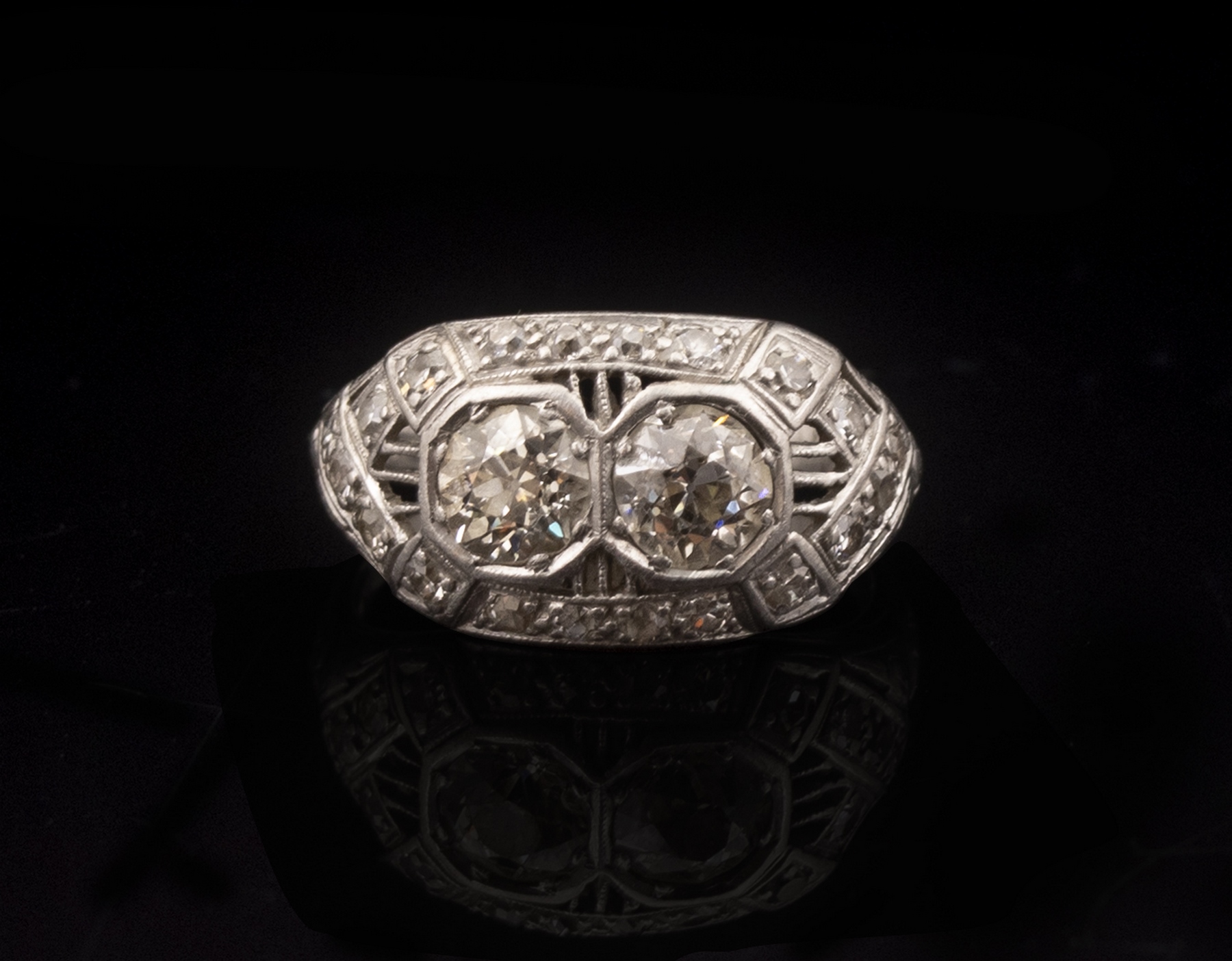 טבעת פלטינה אר-דקו, משובצת 2 יהלומים בחיתוך אלט-שליף במשקל כ-חצי קראט כ"א, וכ-20 יהלומים במשקל כ-1 נק' כ"א. סה"כ כ-1.2 קראט יהלומים. מידה: 7 US, משקל: 5.2 גרם. לא חתומה פלטינה נבדקה.