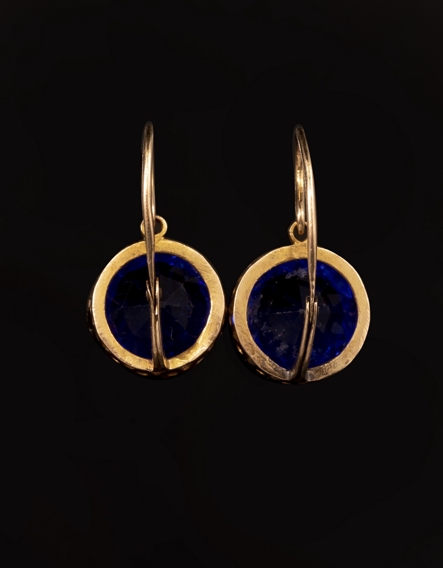 זוג עגילי זהב 14K משובצים אבן כחולה, קוטר: 12 מ"מ. משקל: 5.6 גרם. לא חתומים, הזהב נבדק.