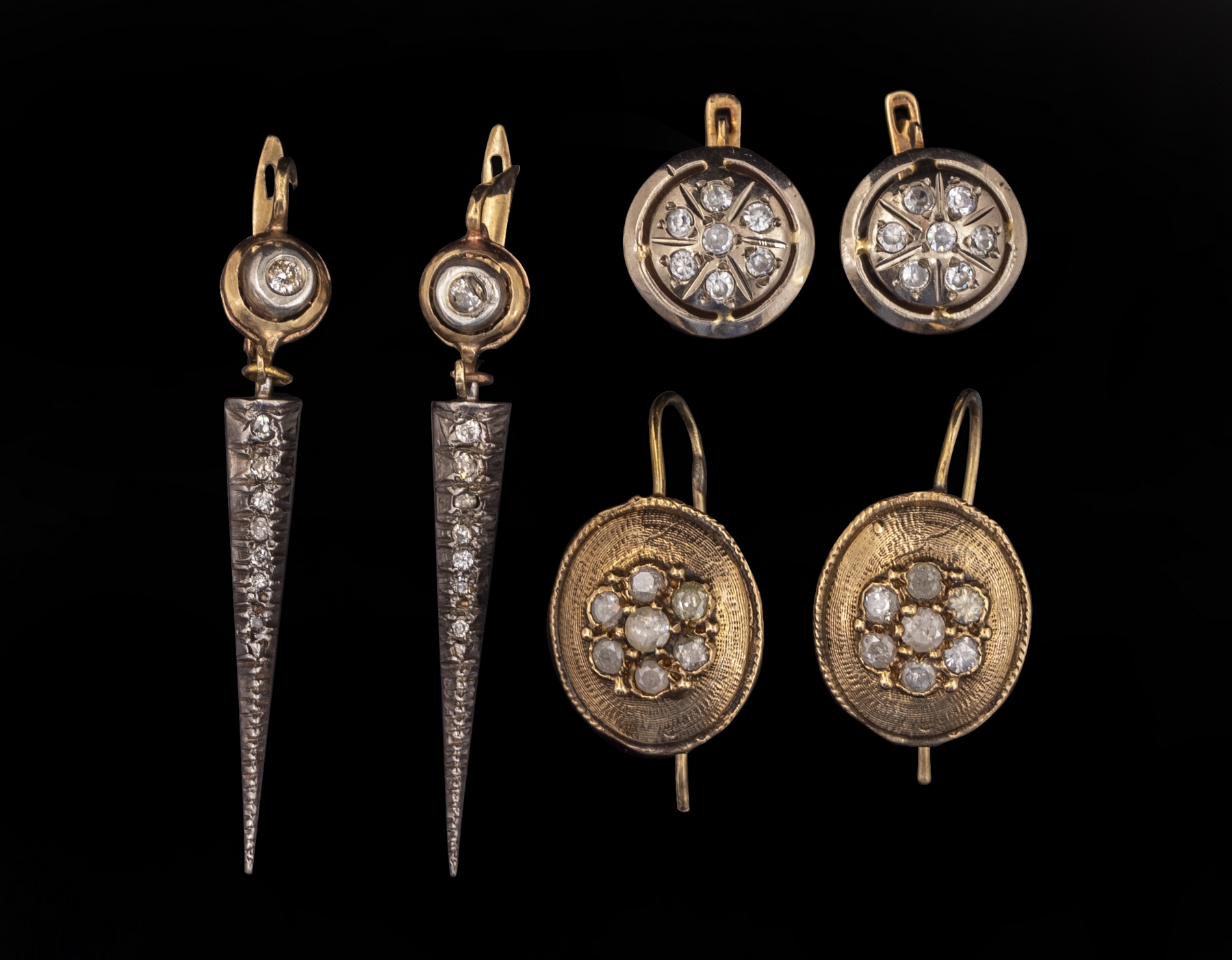 לוט 3 זוגות עגילי זהב 14K, כולל: *זוג משובץ יהלומים זעירים (כ-20 נק' סה"כ) * זוג משובץ דיאמנטים * זוג אחד משובץ אבנים שקופות.
