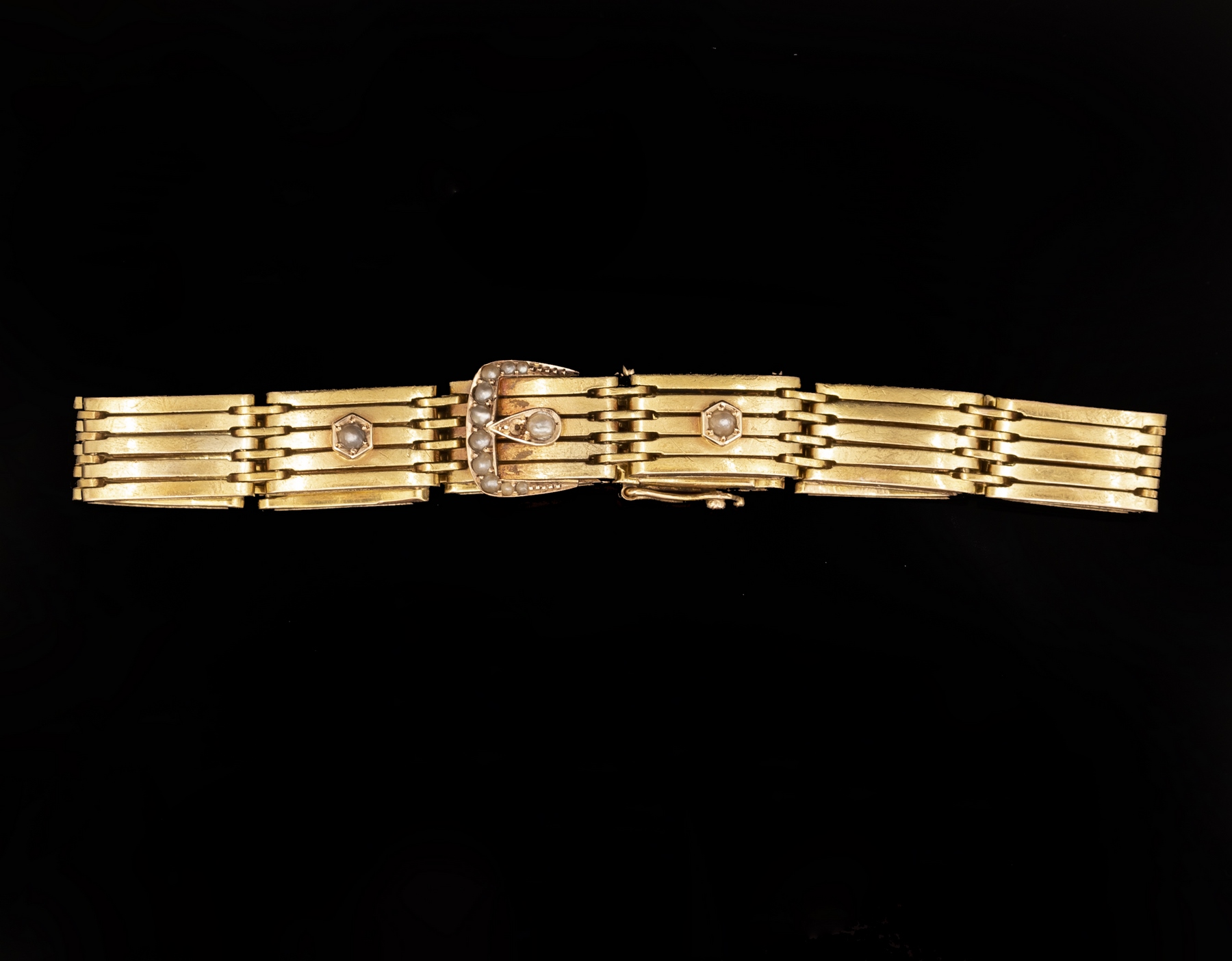 צמיד זהב 14K עשוי חוליות בצורת חגורה. משובץ פנינים. אורך: 19 ס"מ. רוחב: 9 מ"מ. משקל: 23.6 גרם. חתום.