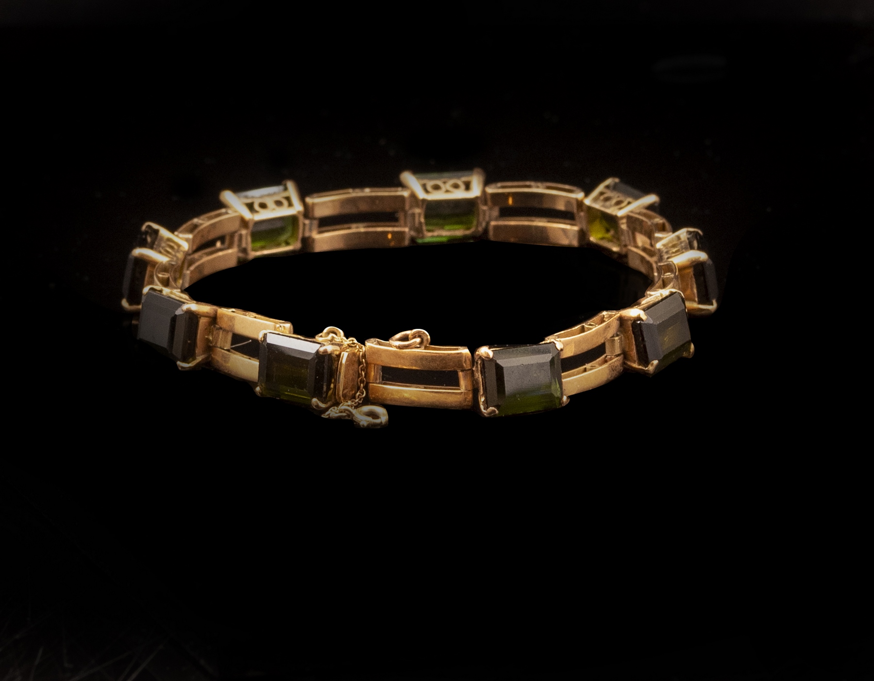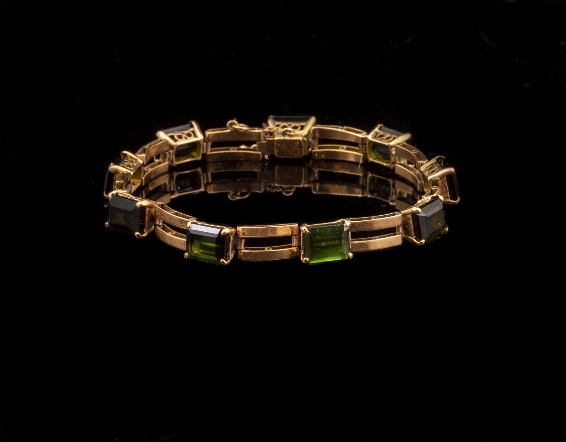 צמיד זהב 14K עשוי חוליות. משובץ 9 אבנים ירוקות (9X7 מ"מ) אורך: 19 ס"מ, רוחב: 7 מ"מ. משקל: 20 גרם. חתום.