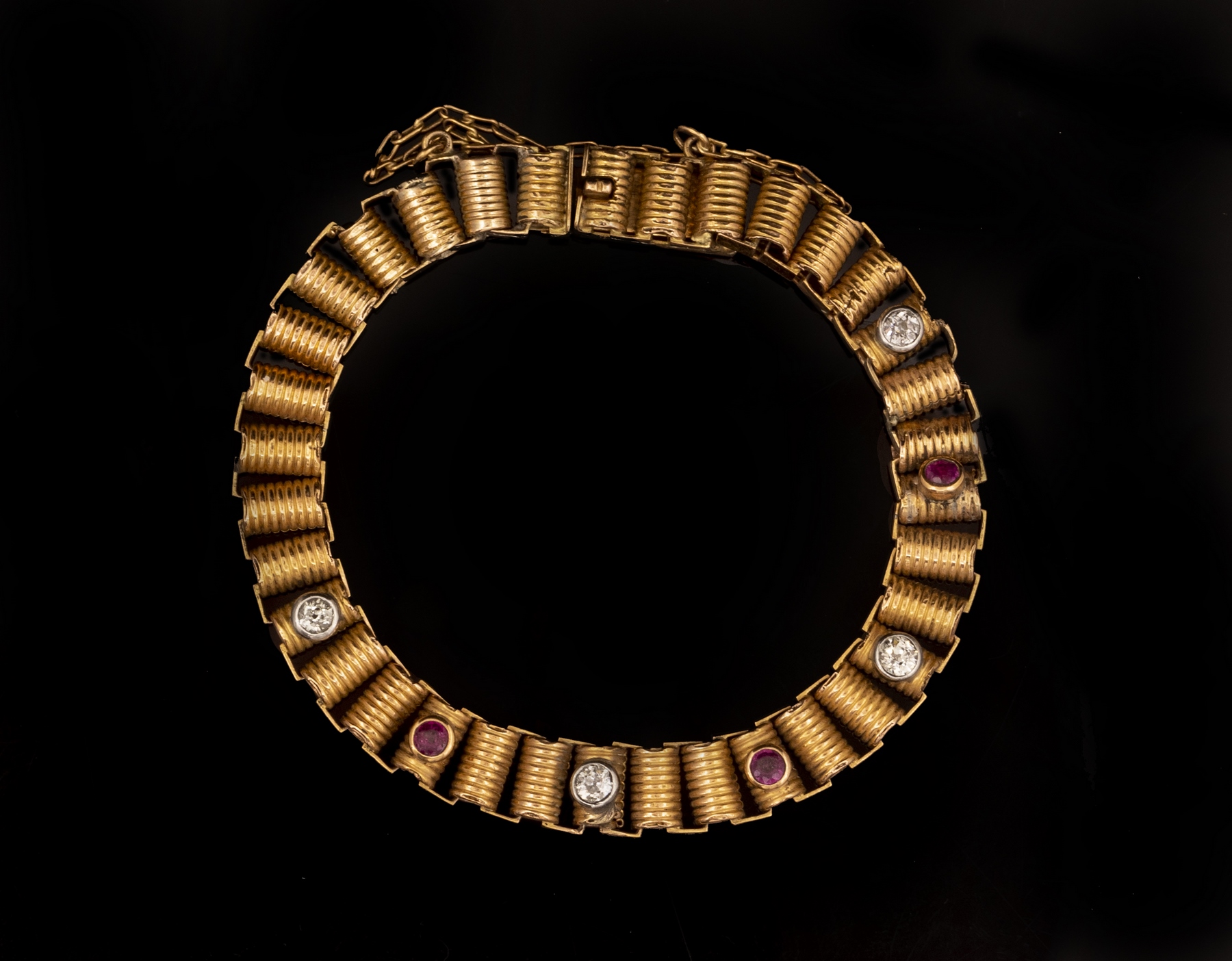 צמיד זהב 18K עתיק, משובץ 4 יהלומים בחיתוך אלט-שליף במשקל כולל של כ-10 נק' כ"א ו-3 אמרלדים. אורך: 16 ס"מ. רוחב: 7 מ"מ, משקל: 16 גרם. לא חתום, זהב נבדק. תיקונים ישנים.