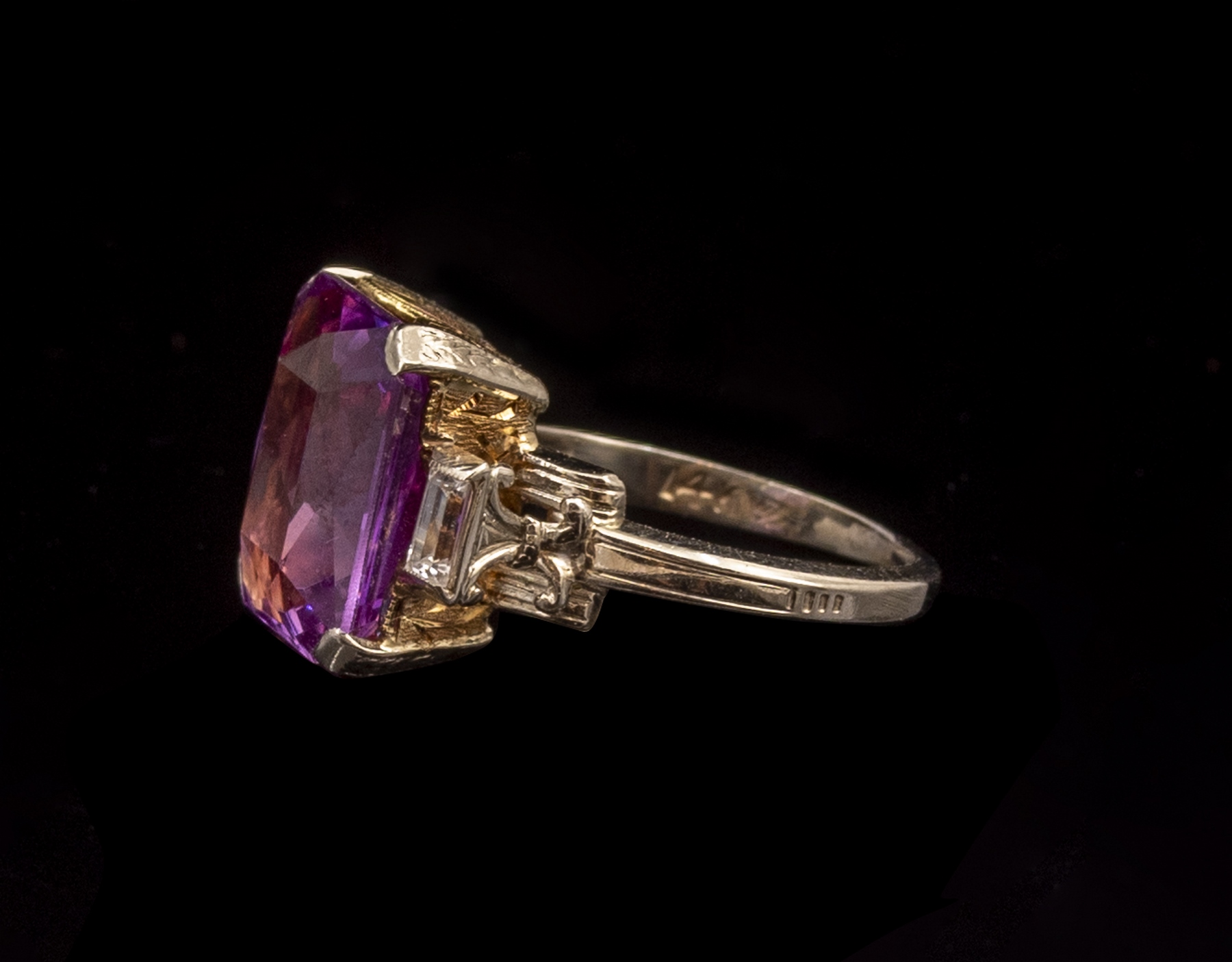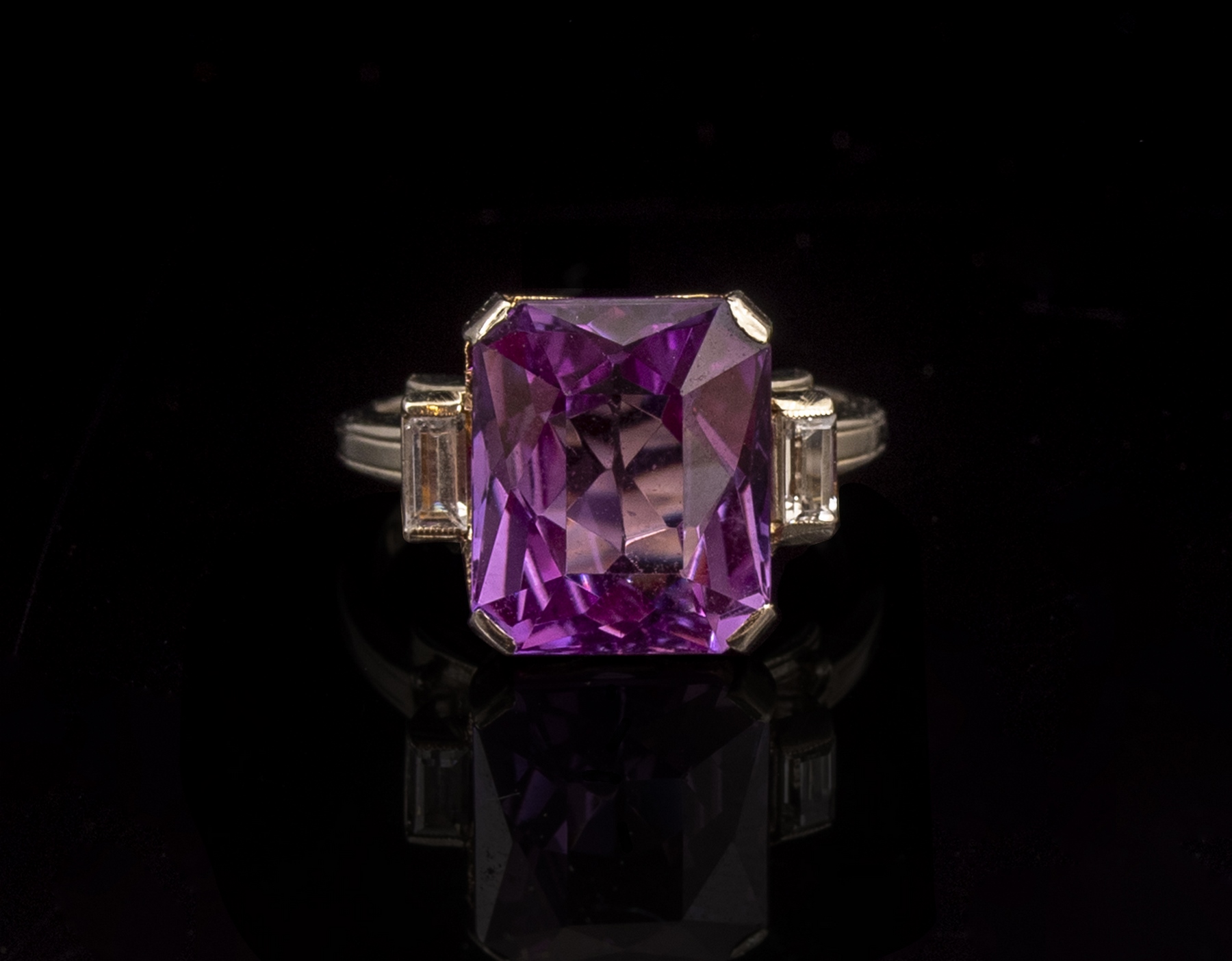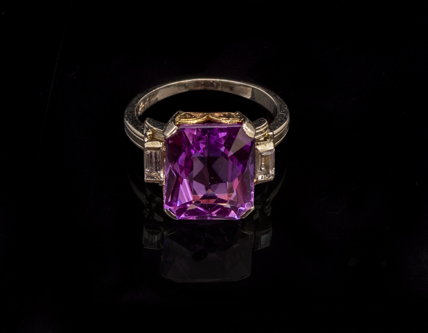 טבעת זהב 14K בשני גוונים. משובצת אמטיסט מרכזית (12X10 מ"מ) ושני יהלומי בגט (8 נק' כ"א). מידה: 5 US, משקל: 5 גרם. חתומה.