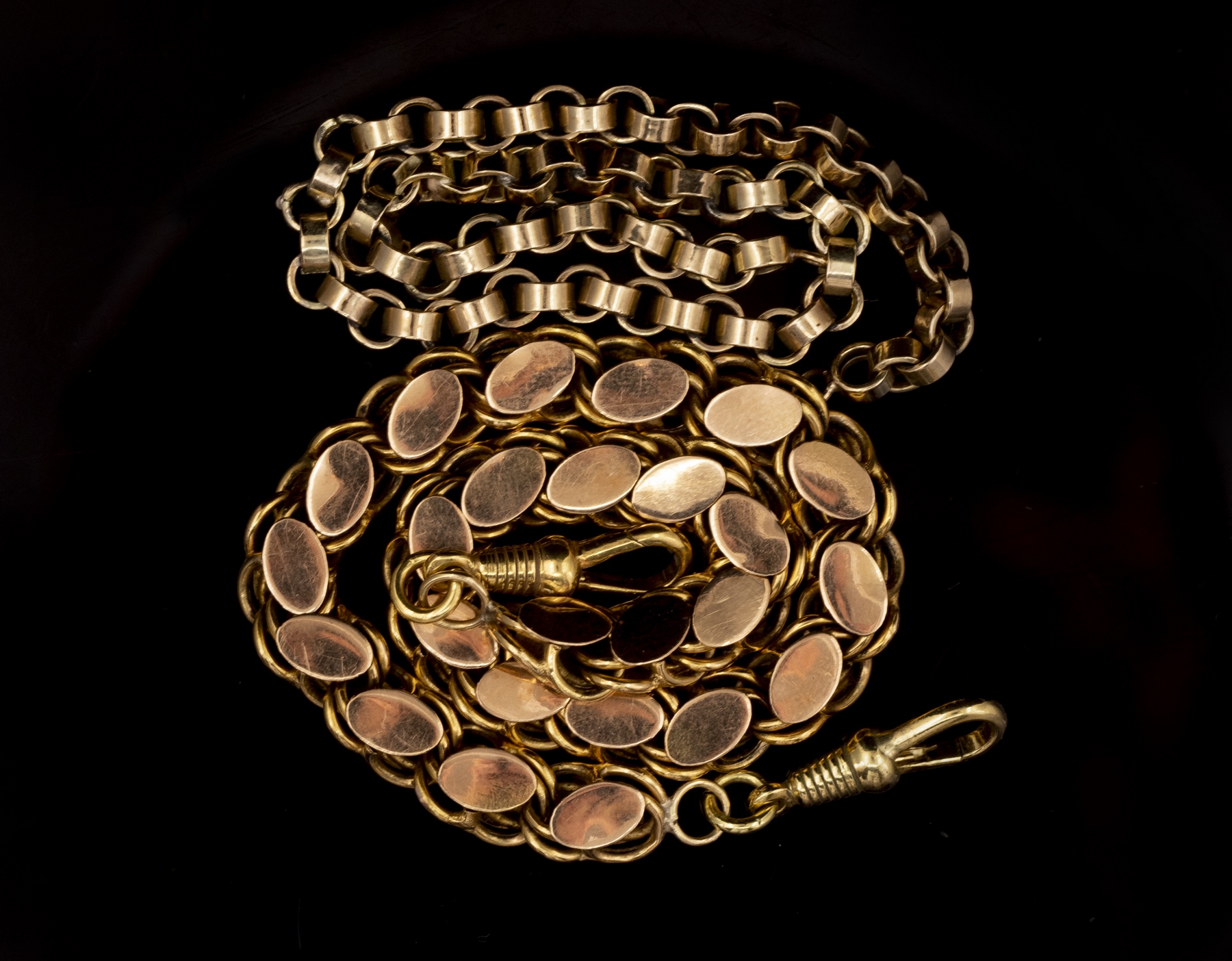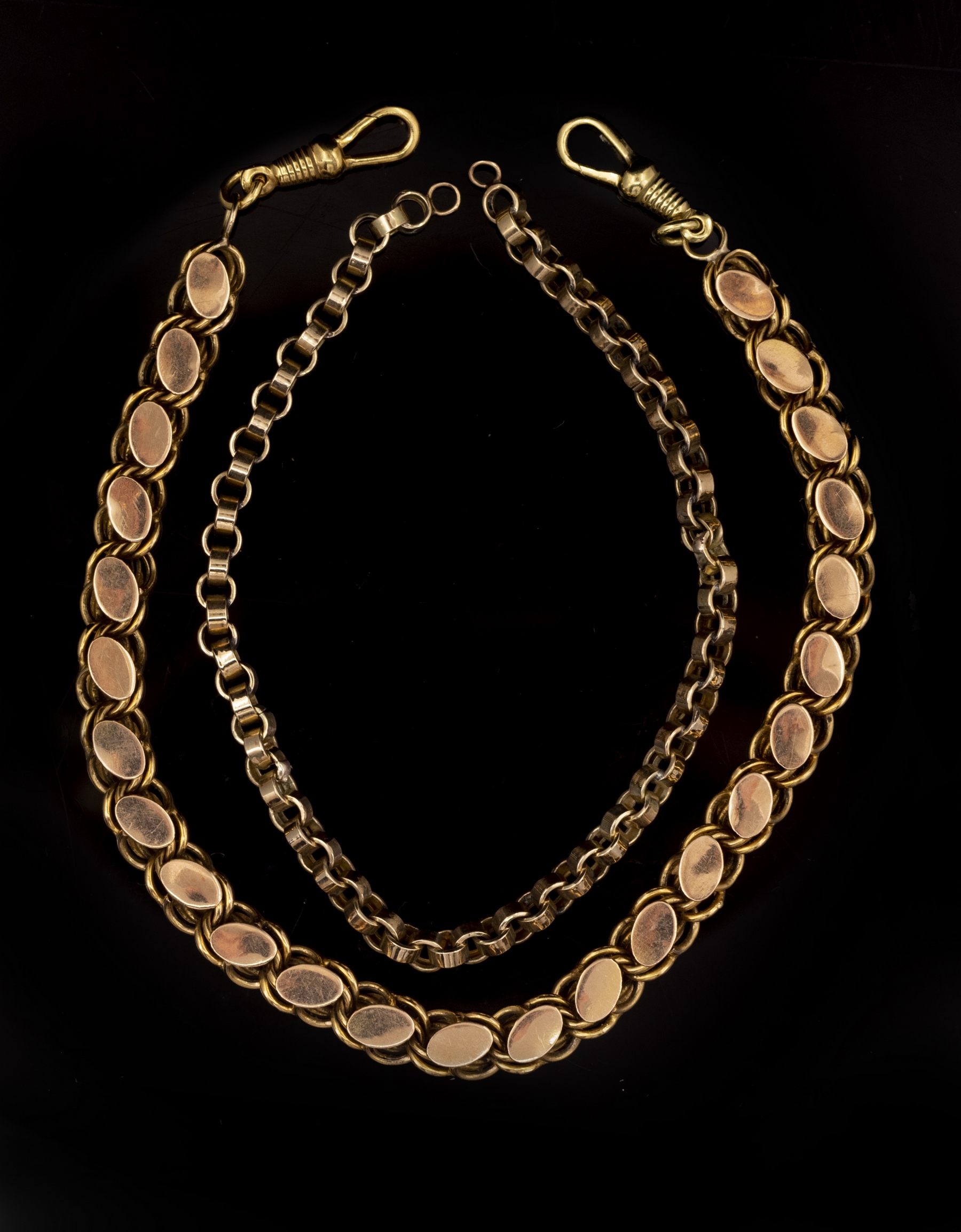 לוט 2 צמידים מזהב עשויים חוליות. כולל: צמיד זהב 18K (הסוגרים לא מזהב) כ-9.5 גרם. וצמיד זהב 14K ללא סוגר. 3.8 גרם. אורך: 13-23 ס"מ. לא חתומים, זהב נבדק.