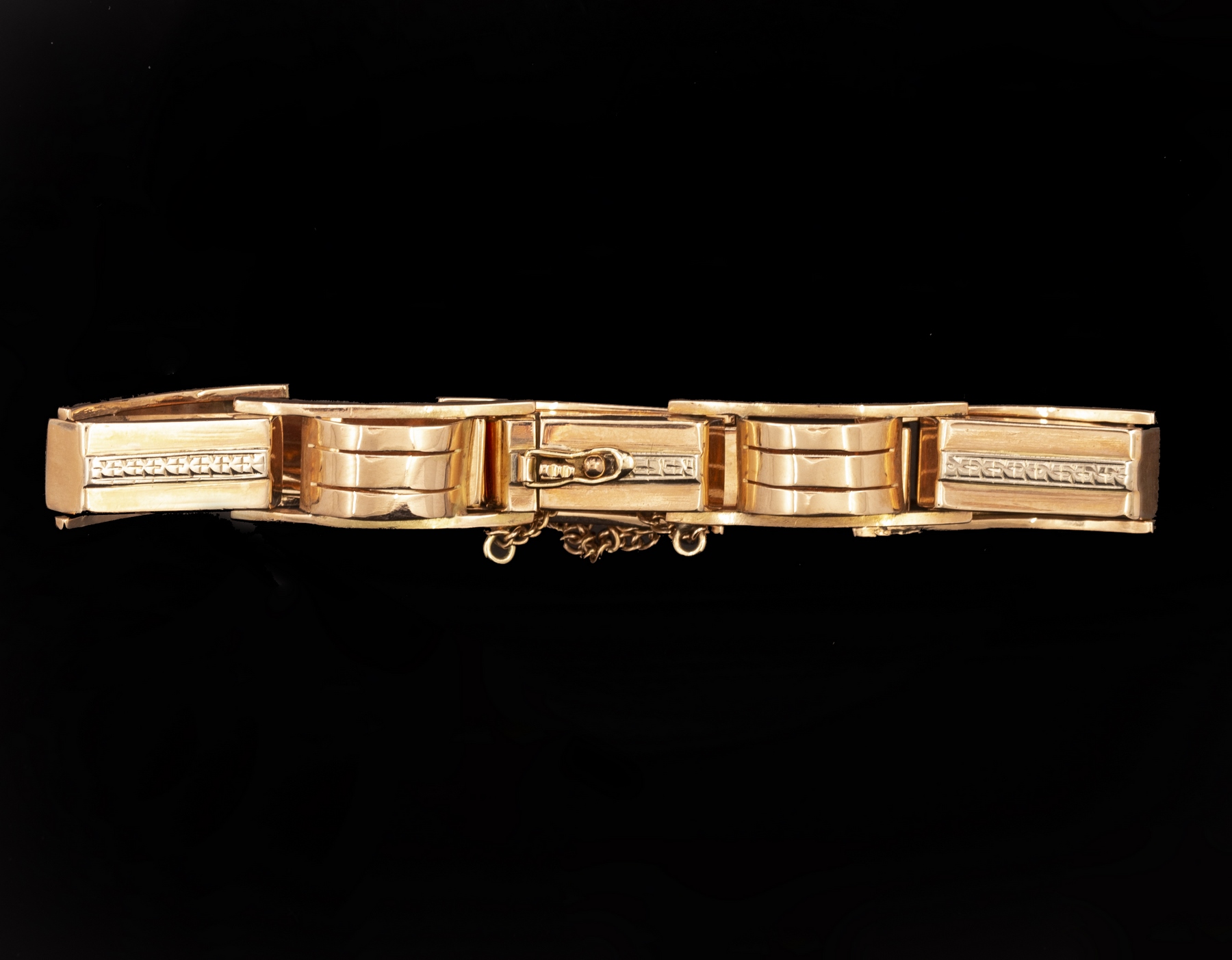 צמיד זהב 14K עשוי חוליות משולב זהב לבן ומעוטר בחריטות. אורך: 18 ס"מ. רוחב: 10 מ"מ. משקל: 22 גרם. חתום.
